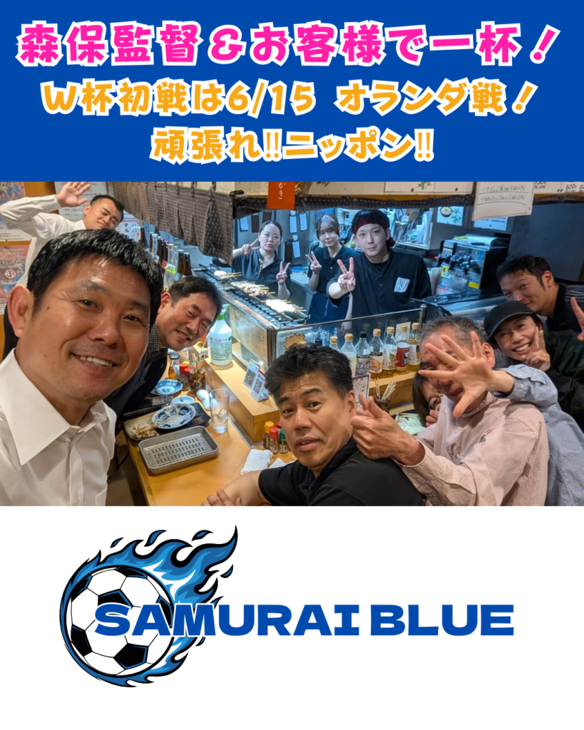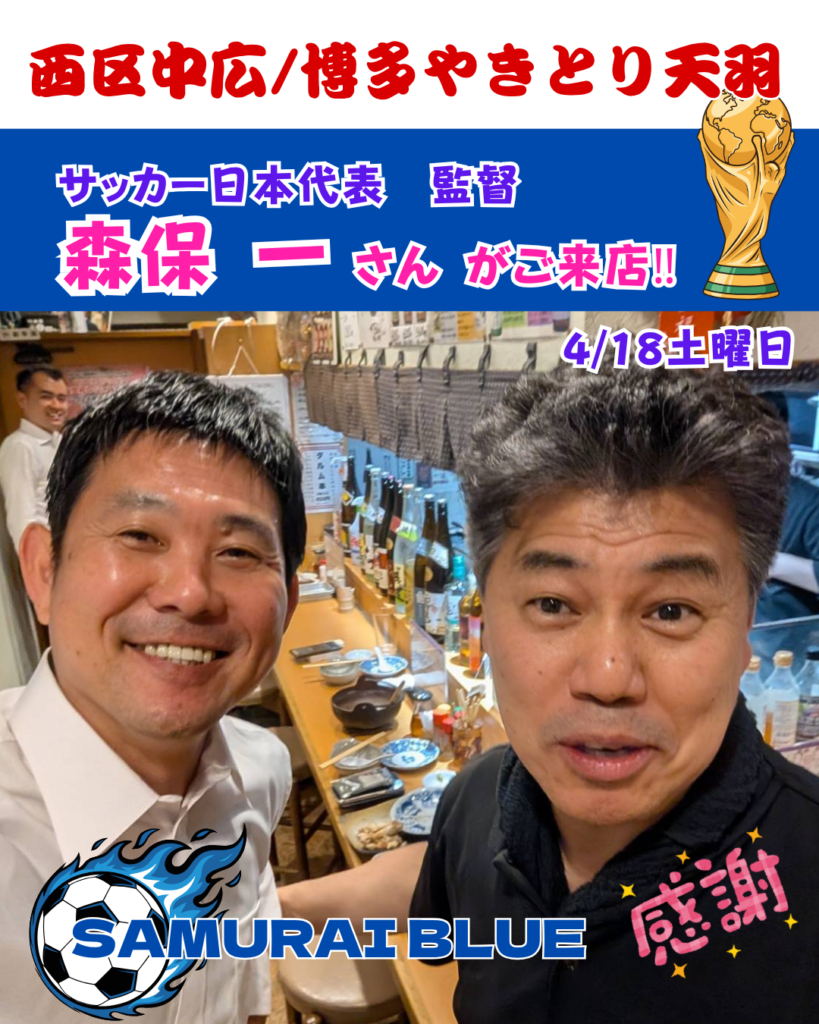 4 202026 4/18土曜 森保監督がご来店! Tweet Share Hatena Pocket RSS feedly Pin it この記事のタイトルとURLをコピーする サッカー日本代表 森保監督がご来店!6月からのW杯を控え、お忙しい中 天羽に来てくれました!勝利を願って、みんなで一杯!まずは6/15のオランダ戦!森保監督は絶対やってくれるはず。天羽もめっちゃ応援します!その時はぜひお店で盛り上がりましょう! Tweet Share Hatena Pocket RSS feedly Pin it この記事のタイトルとURLをコピーする 4/13(月)~19(日) お席、十分空きあります! 前の記事